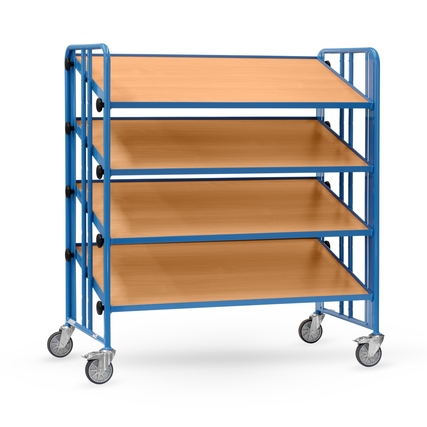 Stahlrohr- und Profilstahlgeschweißt. Schraubkonstruktion. 4 variabel einschraubbare Etagen. Rand 12 mm hoch. Einschraubraster 100 mm, Neigung stufenlos einstellbar von 0° bis 35°. Sichere Arretierung mittels Griffschrauben. Naben mit Rillenkugellager.