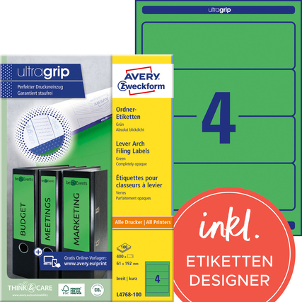 Ultragrip® macht ultra-effizient: die innovative ultragrip®-Technologie mit dem spürbaren Profil auf dem Etikettenbogen gewährleistet einen ultra-präzisen und absolut staufreien Druckerdurchlauf. So arbeiten Sie effizient wie stressfrei und schaffen sich wertvolle Zeit für die wirklich wichtigen Dinge. Ideen drucken – einfach & professionell: mit Etiketten von Avery Zweckform können Sie den kostenlosen Online Etiketten-Designer unter www.avery.eu/print nutzen. Gestalten Sie Ihr Etikett mit der Software komplett selbst, verwenden Sie eine der Design-Vorlagen zu zahlreichen Themen, die Sie individuell anpassen können oder laden Sie Ihr fertiges Design hoch und drucken anschließend standgenau aus. So schnell und einfach sorgen Sie für einen professionellen Auftritt.