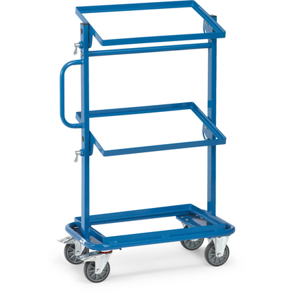 Beistellwagen aus Stahlrohr- und Profilstahl-Konstruktion. Mit 3 offenen Rahmen passend für Eurokästen. Obere und mittlere Etagen nach beiden Seiten um 15° und 30° neigbar. Arretierung mittels Federriegel. Naben mit Rillenkugellager.