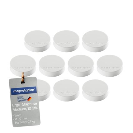 Die Ergo-Magnete mit ergonomischem Griffrand bieten perfekten Komfort in der Handhabung und lassen sich leicht von der Tafeloberfläche wieder abnehmen. Die spezialbeschichtete Magnet-Unterseite verhindert ein Zerkratzen der Oberfläche. Durch die Vollkern Ferrit-Ausstattung verfügen die Ergo-Magnete über für eine besonders hohe Haftkraft. Ein hochwertiger Kleber garantiert den festen Verbund mit den farbigen Kunststoffkappen.
